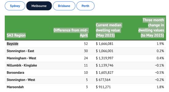 待售房源增幅最大的地区是墨尔本海湾统计区(Bayside Statistical Area),主要包括Bayside市议会辖区内的区,如Brighton及邻近的Sandringham。该地区房产中位价为167万澳元,6月初的待售房源比4月中旬增加了52套。