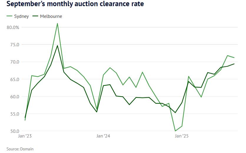 鲍威尔博士分析指出:“悉尼的清盘率虽然出现非常微小的回调,但这是在拍卖量增加的背景下实现的。考虑到从八月到九月市场展现出的韧性,这恰恰反映了买家信心正在回归悉尼市场。墨尔本的情况同样如此,其清盘率自2024年年中以来一直保持明显的上升趋势,这与我们观察到的买家信心整体提升、咨询量上升是一致的。”她特别提到,悉尼有近五分之二(约百分之四十)的九月拍卖房产在正式拍卖日之前就已售出,这是自2021年10月以来的最高水平,表明市场热度正在上升,不过墨尔本的提前销售比例则相对没有那么强劲。