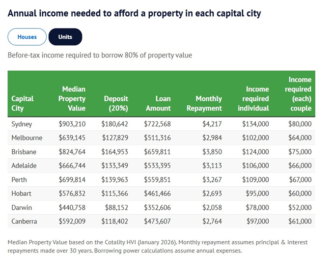 如果夫妻两人都拿全国平均工资,他们合起来在除悉尼外的所有首府城市都买得起中位数独立屋;而在所有首府城市都买得起中位数公寓。