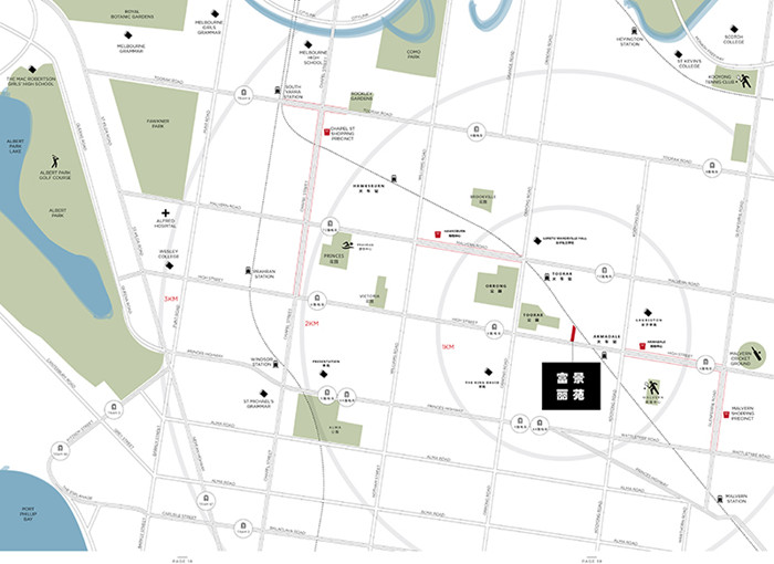 在富景丽苑项目500米以内就有2个绿化公园,Toorak公园和Orrong公园。High街是东南区的主干道之一,沿街遍布各种商铺。