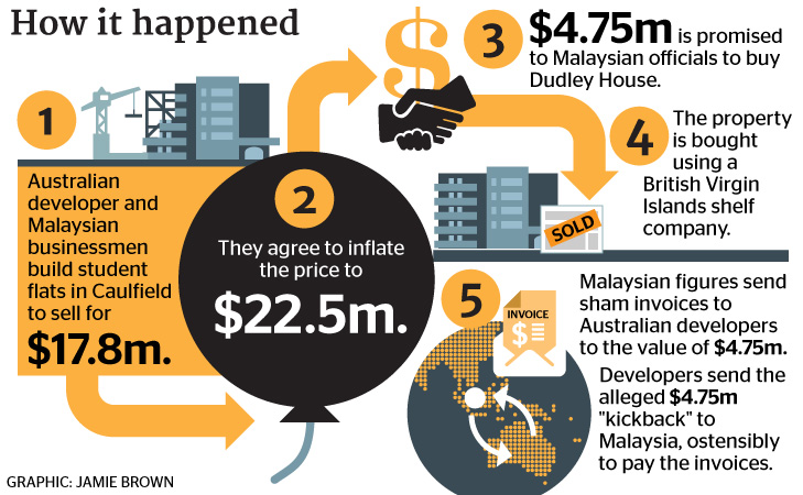 据Fairfax Media报道称,近日一群来自马来西亚的贪官和华裔商人滥用政府投资基金,把一幢公寓楼从1780万澳元炒至2250万澳元,多出的475万澳元则完全洗白。随后,他们又用这笔钱进行贿赂。