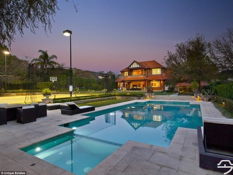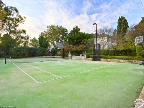 从屋内可以直接通往配备灯光的专业网球场以及时下最先进的高尔夫练球场等。金色叶片装饰的华丽天花板,复古的壁炉,圆顶的天窗以及手工雕刻的木楼梯都让人印象深刻。宅院前还有巨大的配有雕像的喷水池,大车库以及巨大的圆形车道。
