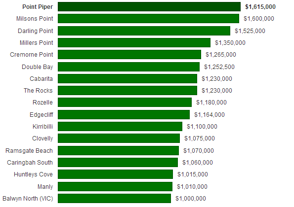 悉尼公寓价格最贵的城区是皮蓬角(Point Piper),中值达到161.5万,其次是米尔逊角(Milsons Point)160万、达令角(Darling Point)152.5万。其他新上榜的城区包括2个南部城区:拉姆斯盖特海滩(Ramsgate Beach)107万和南卡灵巴(Caringbah South)106万,而曼利(Manly,101万)是唯一一个上榜的北滩城区。