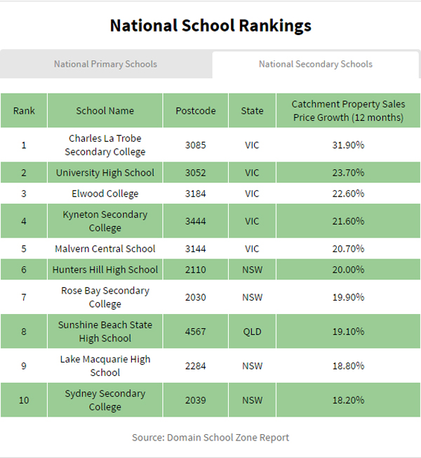 Domain集团的首席数据研究师Nicola Powell指出:处于学区范围内并不是这些房产强劲价格增长的唯一因素,房屋所位于的区有高额的房屋销售也是原因之一。排名全国领先的高中Macleod‘s Charles La Trobe Secondary College曾经是预算较低的社区(所处区域:MacLeod West),但现在房价增长却排名全国领先。在MacLeod West,Viewbank College是最受欢迎的高中,而很多买家如果无法承担附近的房价,就会转而购买Charles La Trobe校区的房屋。此外,一些校区房的范围是有所重叠的,这意味着销售可以计入多个地区的增长。