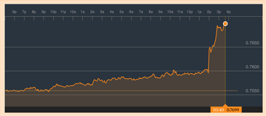 据Yahoo新闻报道,今天早上,美联储宣布加息25个基准点,基金利率目标区间被调整到了0.75%到1%之间。澳洲东部标准时间早上6点35分,澳元汇率达到76.94美分。要知道,仅仅一天前,澳元汇率还保持在75.71美分。截止到悉尼地区时间早上九点,澳元汇率已经上涨了1.9%,达到77.05美分,而且还有继续上涨的势头。澳元对美元汇率上一次突破78美分,还要追溯到2015年5月底。2016年1月中旬,澳元一度下滑到69美分。