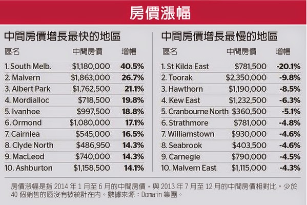 2014年上半年的房价统计数据出炉。市场上总是赢家与输家并存,上半年墨尔本房市的赢家和输家桂冠分别由南墨尔本(South Melbourne)和St.Kilda摘取。