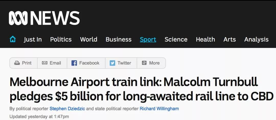 据《ABC NEWS》报道,澳洲总理谭保承诺,联邦政府将出资 50 亿澳元,全力打造墨尔本 Tullamarine 机场铁路线。