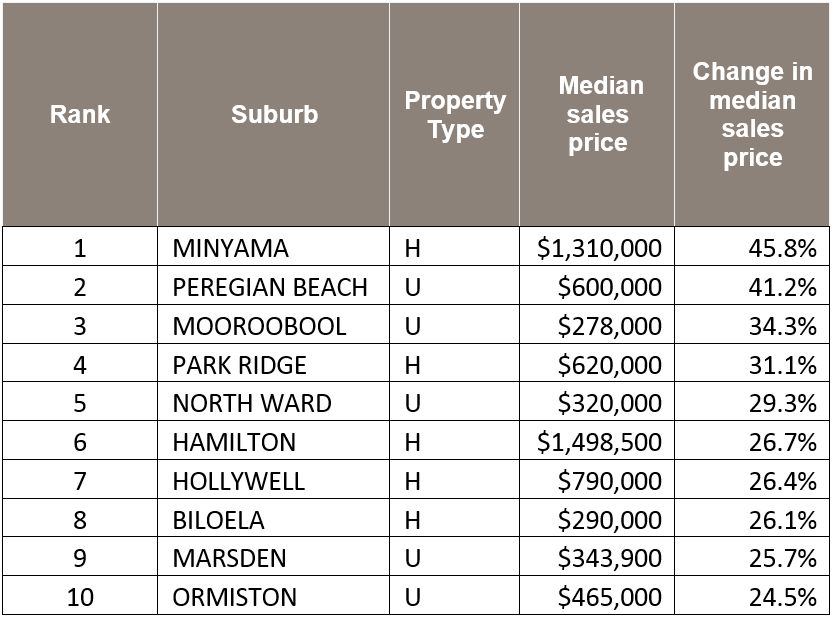 排在前10位的城区包含了不同类型的地区,例如布里斯班及其外围地区、黄金海岸、阳光海岸和汤斯维尔。只有一个城区是在布里斯班市,就是Hamilton,这反映了最近昆州乡镇地区需求强劲。