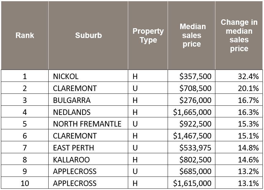排名前十的包括珀斯的八个城区和两个Pilbara的城区。Claremont和Applecross因独立屋和公寓的增幅都非常强劲,所以在榜上出现两次。