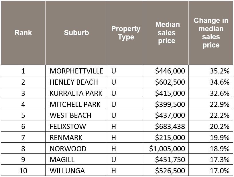 前10名的城区都位于阿德莱德,而Norwood的中位价去年突破了一百万元。