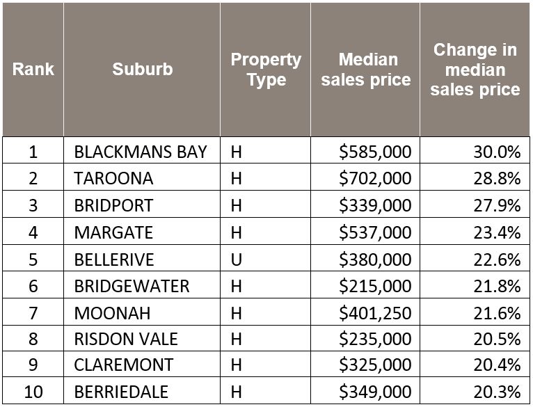 排名前十的城区都位于大霍巴特以及塔州东北部的Dorset地区。霍巴特经历了两年非常稳健的资本增长,在过去一年里一直超越其他首府城市。这些城区的物业中有一些上市的时间非常短便能售出,例如在Bellerive (公寓)和Claremont(独立屋)只需7天,而在增幅最大的城区Blackmans Bay也仅需13天。