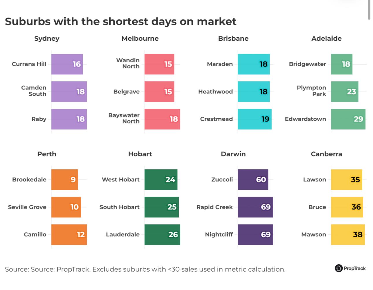 然而,许多郊区的房产出售得更快。我们查看了每个城市市场中位日数最短的三个郊区,以确定它们是什么。