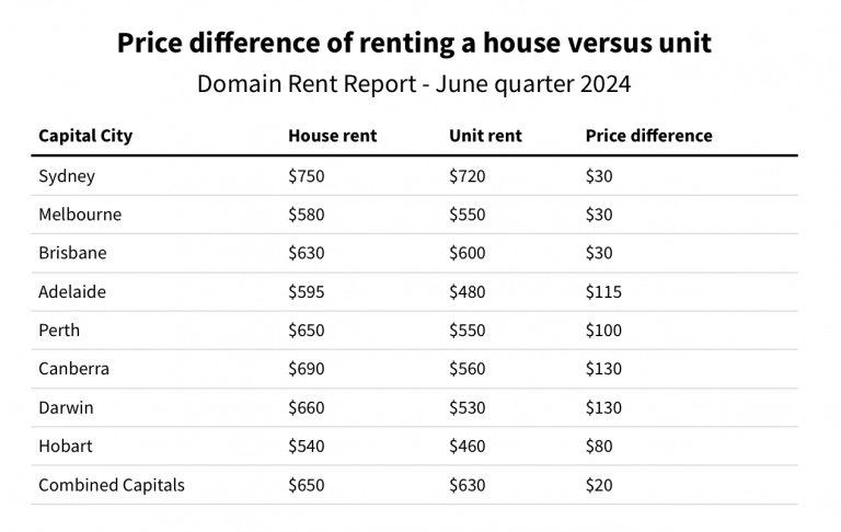 上周发布的最新《Domain租金报告》(Domain Rent Report)显示,在悉尼、墨尔本和布里斯班,独立屋和公寓之间的周租差距已经缩小到仅相差30澳元。