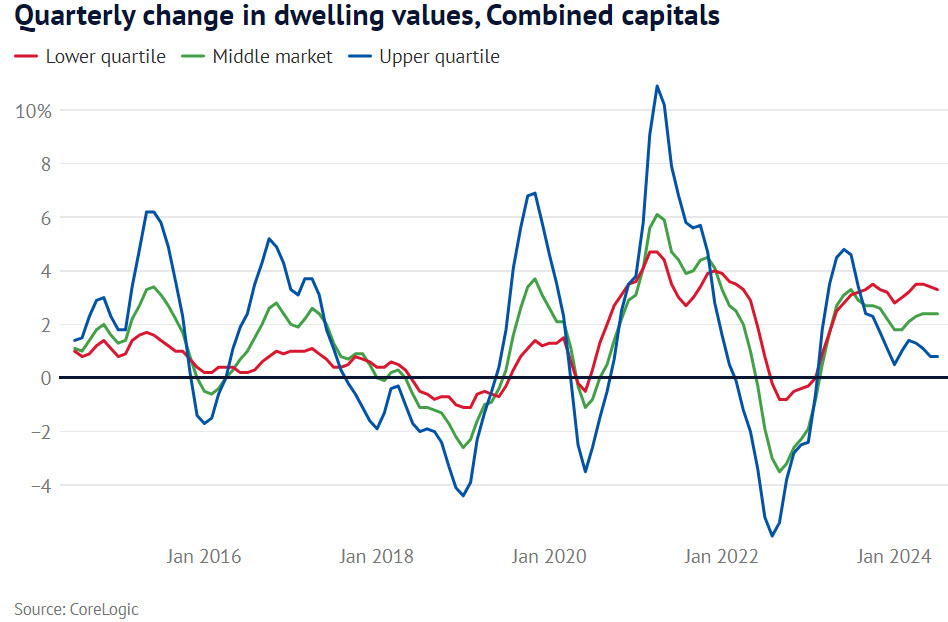 CoreLogic 数据显示,过去三个月,澳大利亚各首府城市市场最低端四分之一的房价增长了 3.3%。同期,它轻松超过了最高四分之一的房价,后者仅仅增长了 0.8%。