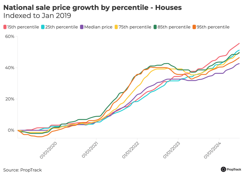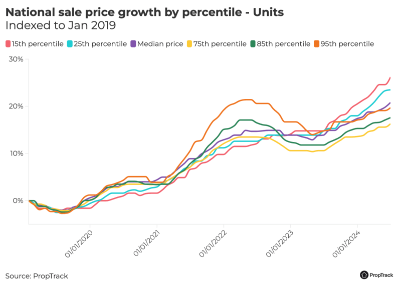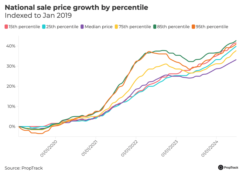 此外,投资者已重返市场,青睐更实惠的房产。由于利率高企,许多买家只能购买更便宜的房产,这增加了需求,并推高了这些较低百分位数的房价。