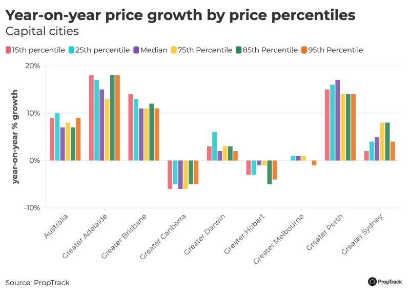 阿德莱德在较低和较高层级的增长情况相似(过去12个月总计增长了18%),而布里斯班、达尔文和珀斯在较低百分位数的增长更快。