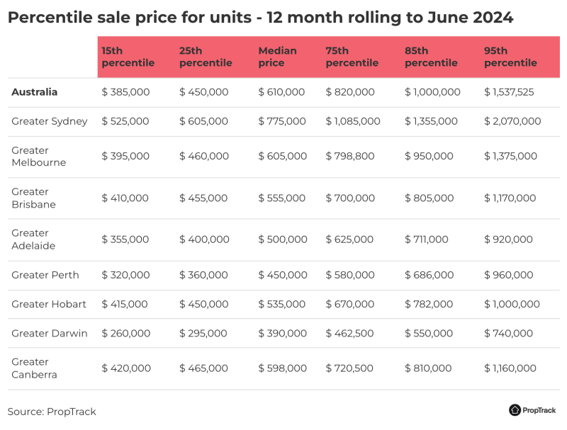 悉尼再次出现了最大的差异,第15个百分位数为525,000澳元,而第95个百分位数为207万澳元——相差近155万澳元。