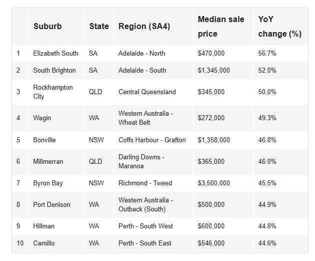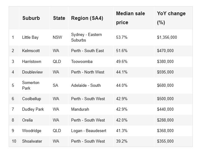 可负担性是今年表现最好的地区的共同点,在房屋和公寓价格增长最快的十大郊区中,大多数郊区的房屋和公寓平均售价都在 60 万澳元以下。
