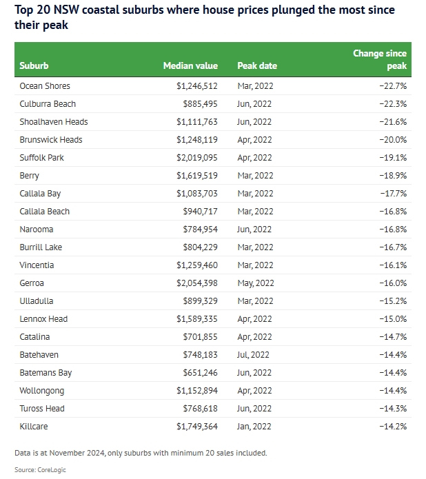 新南威尔士州一些最美丽的海滨城镇的房价自巅峰时期以来已下跌逾 20%,因此出现了一些海滨便宜房产。
