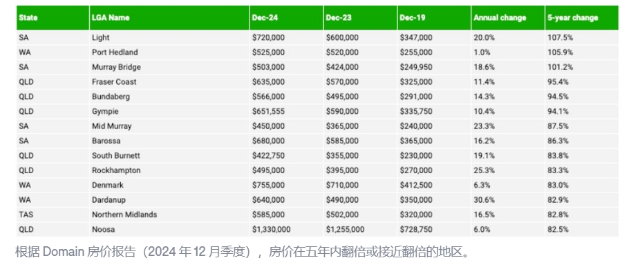 其他地区的价格涨幅在 82% 至 95% 之间,且全部来自西澳、昆士兰或南澳。