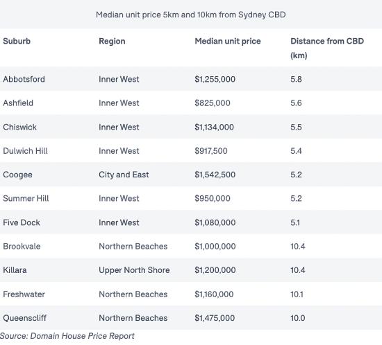 根据Domain的数据,悉尼CBD 5km半径内的一些地区公寓中位价,与10km半径内的地区相似,甚至更低。
