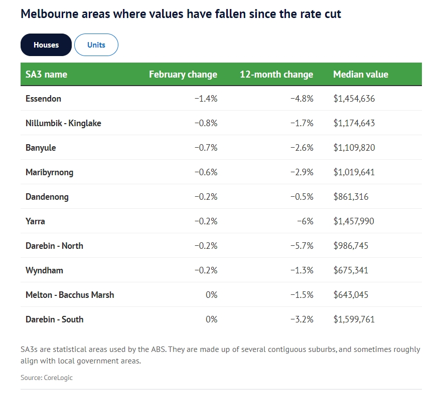 自二月份储备银行降息以来,墨尔本多个地区的房价出现下跌,而上个月全市房地产市场则出现上涨。