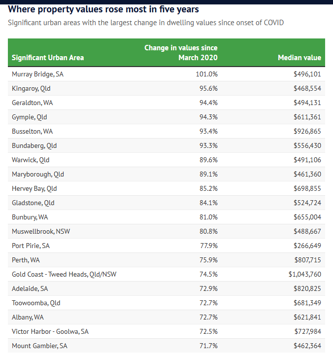 其中涨幅最大的是南澳的Murray Bridge,自2020年3月以来,该地区房价翻了一番,典型住宅中位价上涨101%,达到$496101。