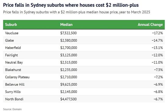Domain公布的房价报告显示,在截至2025年3月的1年时间内,Vaucluse房价中位数下跌了17.2%,降至732万澳元。