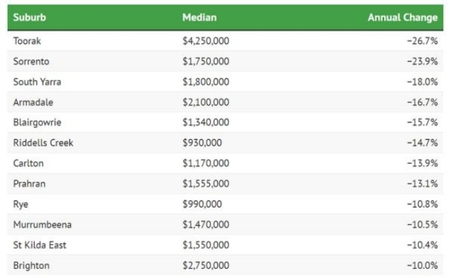 Mornington Peninsula地区的热门度假区同样下滑明显,Sorrento中位价下跌23.9%至175万澳元,Blairgowrie则下跌15.7%至134万澳元。