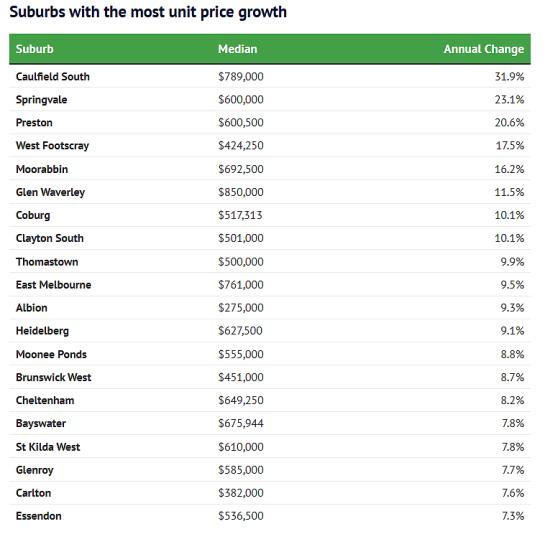 紧随其后的是Springvale,公寓中位价上涨了23.1%,至60万澳元。Preston的公寓中位价上涨了20.6%,至60.05万澳元。