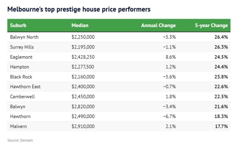 根据Domain的数据,在墨尔本所有中位房价超过200万澳元的郊区中,Balwyn North过去五年涨幅最高,达到26.4%,目前中位价为225万澳元。