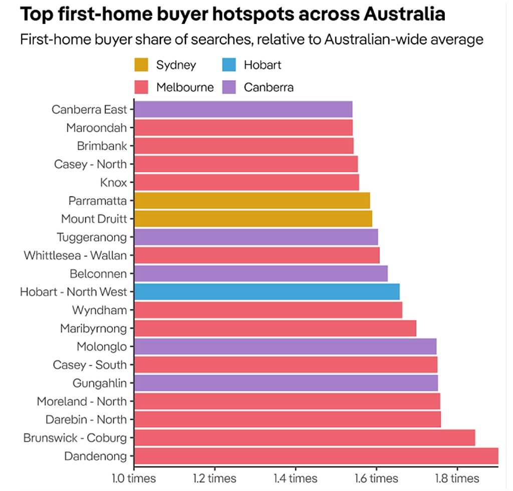 Dandenong位居榜首,关注该区的首次购房者数量几乎是平均水平的两倍。内北区 Brunswick-Coburg排名第二,紧随其后的是Darebin与Moreland。前20大热门区的评选标准为“首次购房者搜索量占比(相较于其他购房者)最高”,其中近半数位于墨尔本远区。