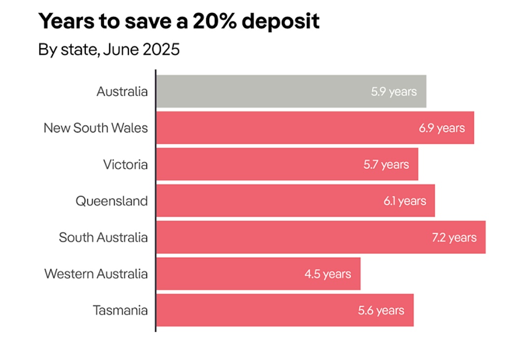 对于普通收入家庭而言,攒够首付的时间已延长至5.9年,在新州(6.9年)与南澳(7.2年)甚至更久,因此大多数首次购房者选择以更低首付入市。
