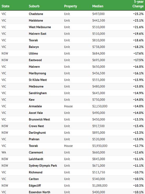 跌幅最大的主要是公寓市场,其中大部分位于墨尔本,其次是悉尼,榜单上只有一个来自新州和维州以外的城区。