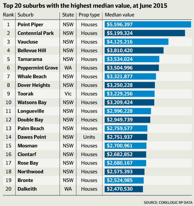 CoreLogic RP Data整理了截至6月份的年度数据,发现在全国房价中值超过200万的48个城区中,悉尼占了40个,而它的海港富人区皮蓬角(Point Piper)再度荣登榜首,房价中值达到560万。