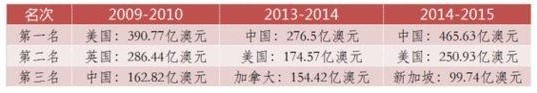2009-2010年年报,中国是澳大利亚第三大投资国,位居美国和英国之后;仅仅4年后(即2013-2014年年报),中国一跃成为澳大利亚第一大投资国。