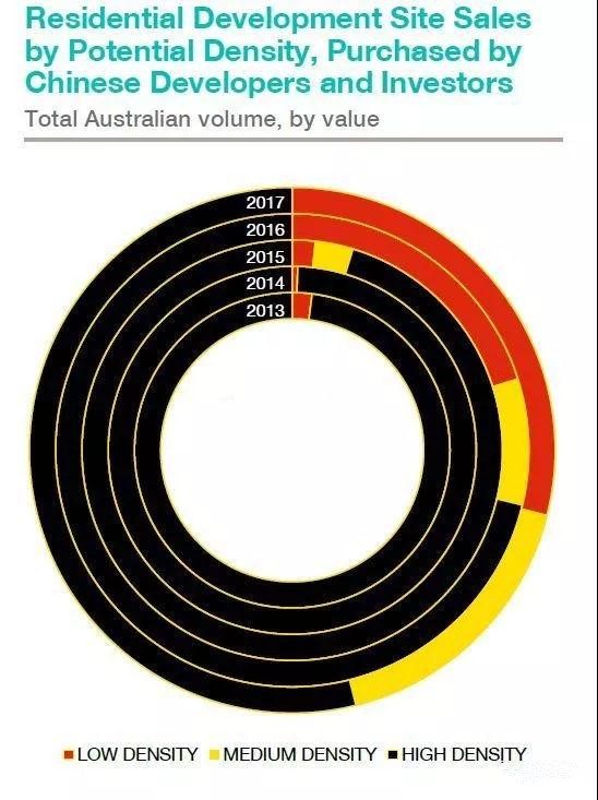 2013年的交易地块平均面积为1200平方米,平均每个地块能够开发大约103座住宅。到了2017年,中国开发商和投资者在澳大利亚购入的普通规模地块平均达到21,785平方米,能够建造约五百多座住宅,这主要是因为投资者转向中低密度项目的开发。