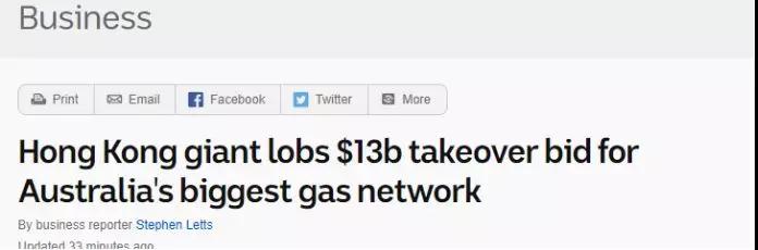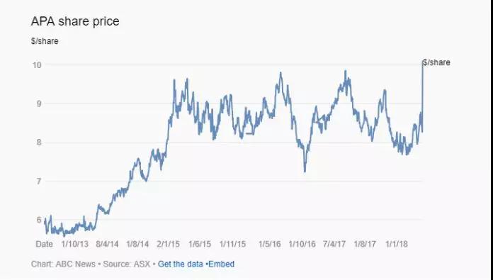 据ABC报道,在今天上午向澳交所发布的一份声明中,APA表示,它收到了长江基建提出的每股11澳元的主动收购提议,比APA上次收盘价高出33%,数字高达130亿澳元!