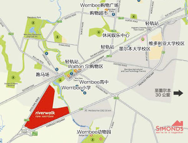 墨尔本市中心(CBD)以西30公里的Werribee,一座新城正在崛起。城际轻轨、高速公路和新的立交系统贯穿其中,使新城和墨尔本中心只在咫尺之间,交通极为便利。而和闹市区不同的是,水岸公园