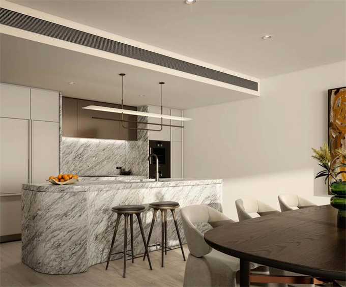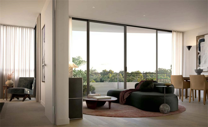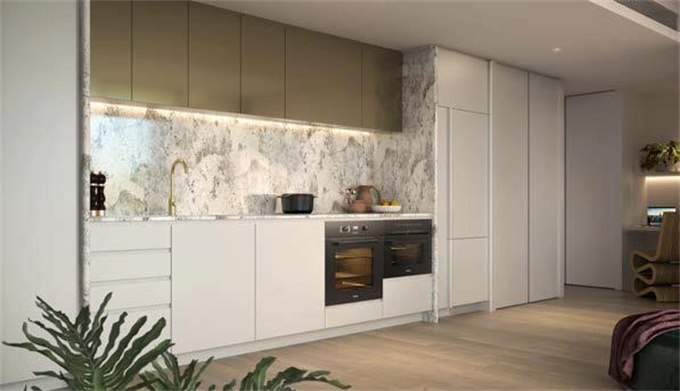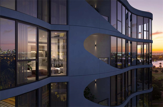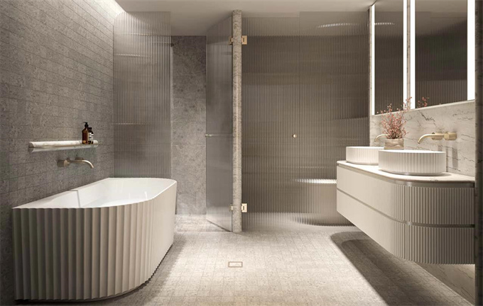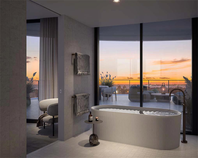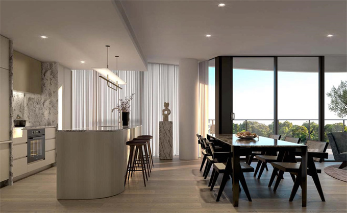 The Albertine的令人印象深刻的建筑展现出自信、宁静和优雅的风采。Mirvac屡获殊荣的室内设计团队巧妙运用坚固材料,如砌体混凝土和铝材。与外部曲线的流畅呼应,Albertine的室内空间以平滑、曲线的语言展现。圆润的边缘在设计中回响,体现在柔和轮廓的石岛台面、凹槽式水槽和浴缸等精致特色中。