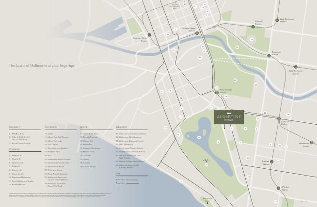The Albertine由Mirvac开发,位于墨尔本皇后巷31号,地理位置优越,位于圣基尔达路区,步行或乘电车轻松抵达。如果您更喜欢自行车出行,也很方便。维多利亚国家美术馆、墨尔本中央商务区、南墨尔本、圣基尔达等众多景点都近在咫尺。坐落在阿尔伯特公园门口,The Albertine与Mirvac旗下的The Melburnian和The Eastbourne 联袂成为独家传世建筑的一部分。