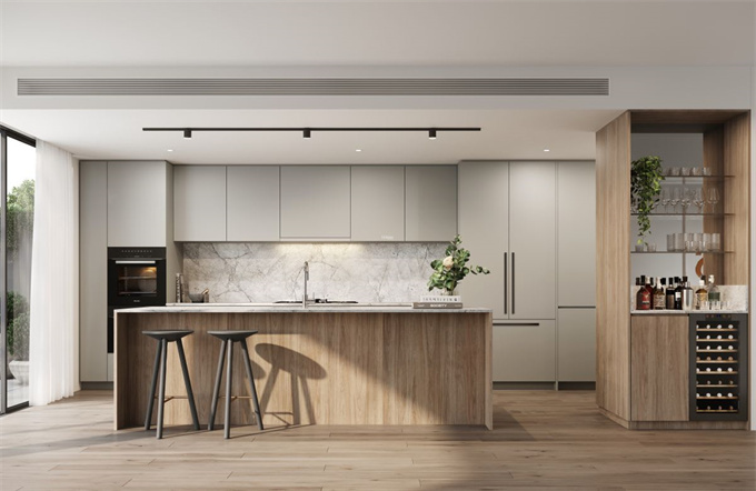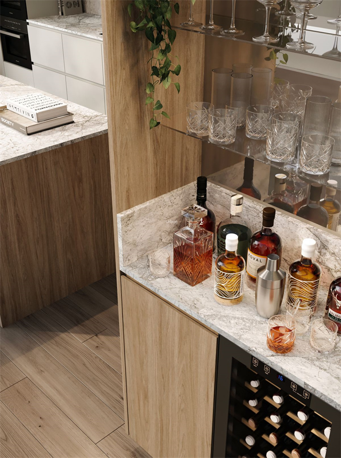 定制细木工为您所有的厨具提供充足的存储空间,而娱乐者则会喜欢宽敞的岛式长凳和管家区。