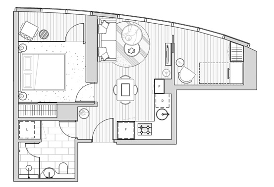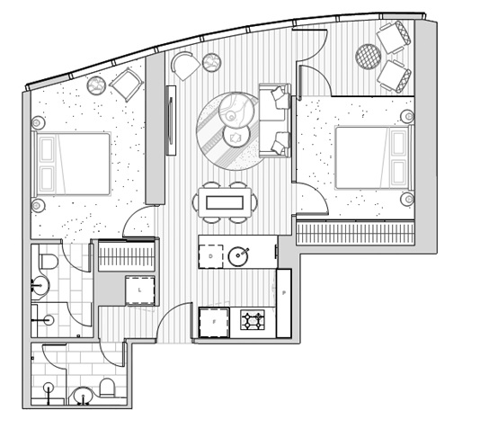 3. 内部设计特色:拥有全方位广阔观景角度的落地窗,醇厚实木地板叠加柔软的羊毛地毯,使地板铺装尽显奢华。黑色金属细节对比金属木工的优雅,加之开放式设计,以适应奢华的城市生活方式。
