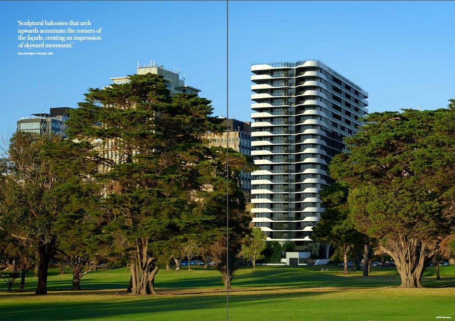 皇后大道12号(12 Queens Road)住宅大厦楼高20层,由 Kangoala 和 PDA Australia 公司联手开发,其建筑如一层层白色扶手栏杆向上延伸,设计巧妙且风格独特。该项目预计于2017年年底落成,涵盖238套一室、二室和三室公寓,以及两套顶层豪华公寓。公寓拥有无与伦比的视野,使阿尔伯特公园湖、菲利普港湾和墨尔本中央商务区的美景一览无余。