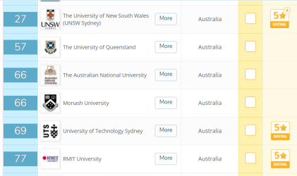 这些进入前百的高校排名从高到低,依次是新南威尔士大学、昆士兰大学、澳国立大学、莫纳什大学、悉尼科技大学和RMIT。