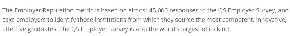 而QS对雇主声誉的度量标准是非常严格的,几乎可以说是严苛:机构收集了将近45,000份雇主答复,要求选出最能干、创新、高效的毕业生,然后统计他们的毕业院校。